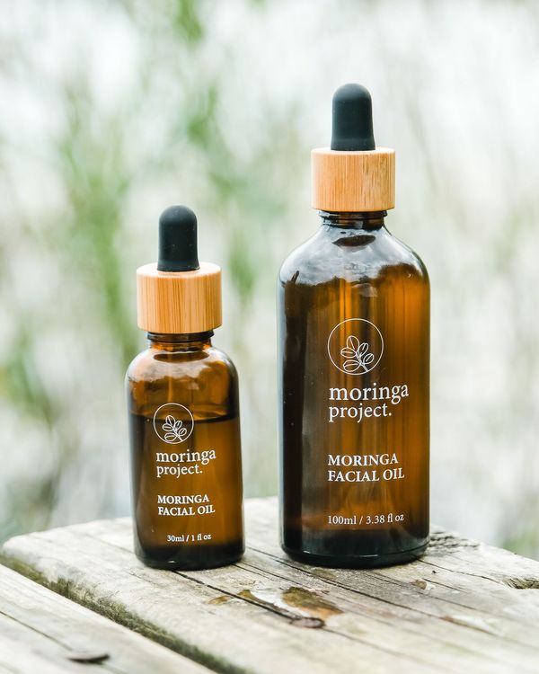Our facial oil is specially formulated with nourishing, hydrating, and detoxifying Moringa seed oil, which helps to neutralize harmful pollutants, protect against sun damage, reduce visible signs of aging, and soothe inflammation. The result is brighter, softer, and more youthful-looking skin. We highly recommend using our Moringa Project Facial Oil as a multi-use miracle oil for your face, body, and hair.